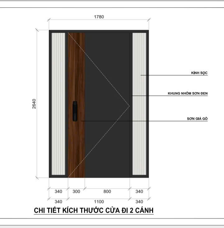 Chú thích ảnh:Chi tiết kích thước và cấu tạo mẫu cửa nhôm đúc hiện đại kết hợp kính sọc và sơn giả gỗ.