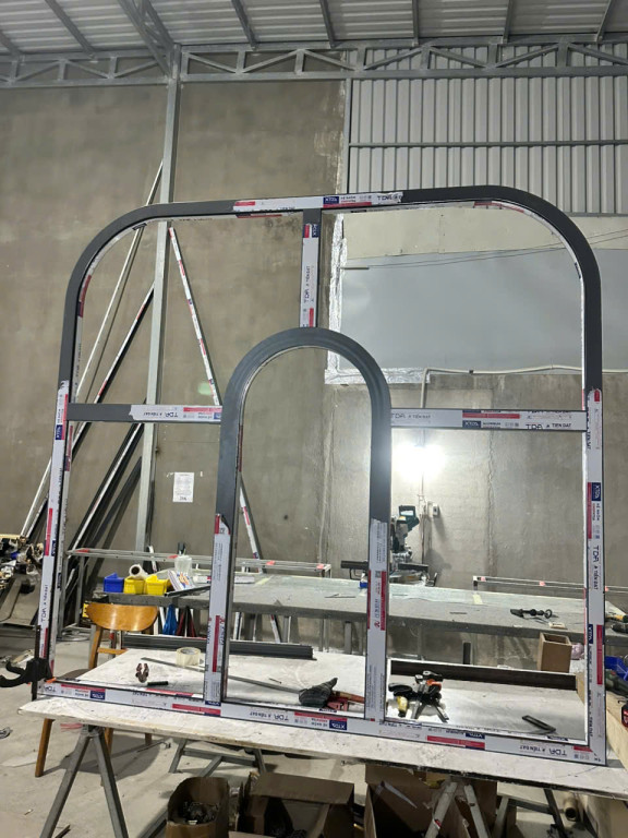 Chú thích ảnh: Khung nhôm hệ được gia công vòm thực tế tại xưởng với đường cong mượt mà, không bị biến dạng bề mặt.