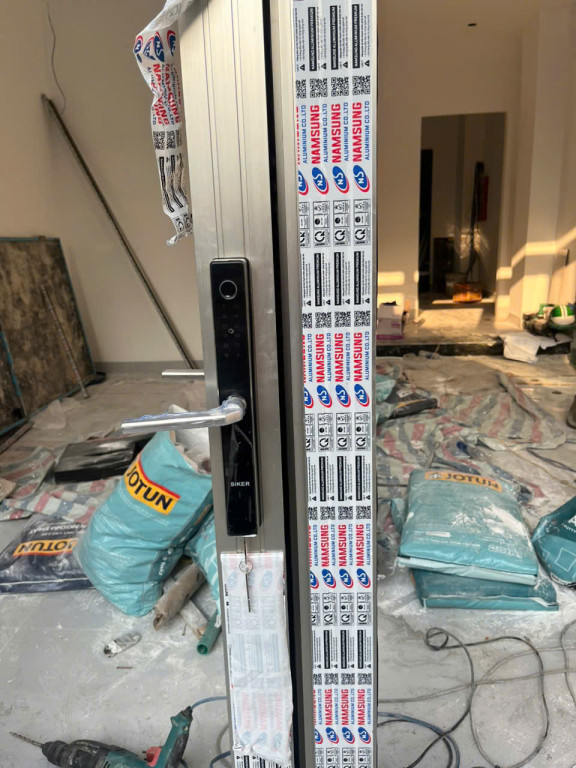 Hình ảnh trực diện của khóa Siker KTS 151 lắp trên cửa nhôm.Chú thích ảnh: Cận cảnh thiết kế sang trọng và tinh tế của khóa thông minh Siker KTS 151 phiên bản mới nhất.