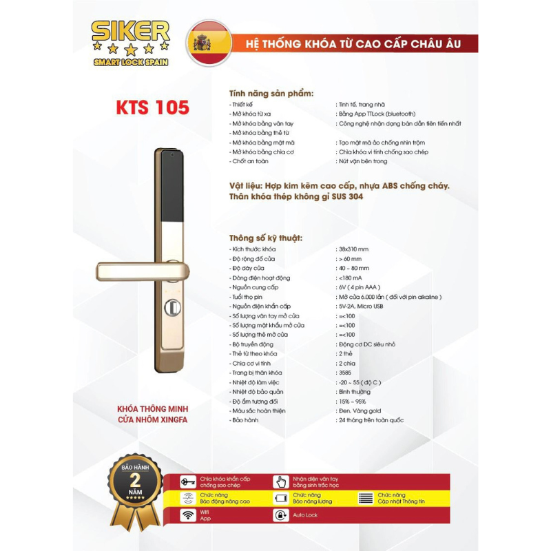 Khóa điện tử Siker Spain là dòng đa dạng mẫu khóa, phù hợp các loại cửa gỗ, cửa kính, cửa nhựa, cửa nhôm xingfa, cửa sắt.. Mở khóa bằng nhiều chức năng như: Mở bằng điện thoại từ xa không giới hạn khoảng cách; Vân tay cảm biến sinh học; Mã số; Thẻ từ; Chìa cơ vi tính; Nhận diện gương mặt; Quản lý qua app…