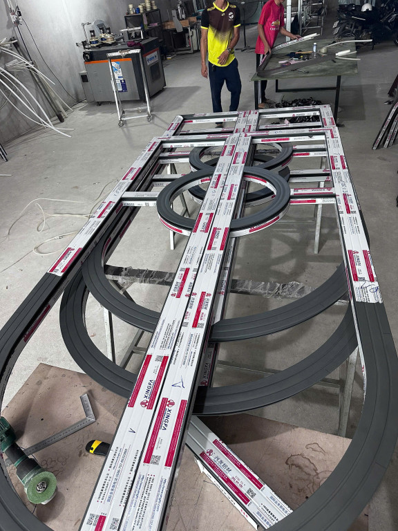 Chú thích ảnh: Khung nhôm hệ được gia công vòm thực tế tại xưởng với đường cong mượt mà, không bị biến dạng bề mặt.