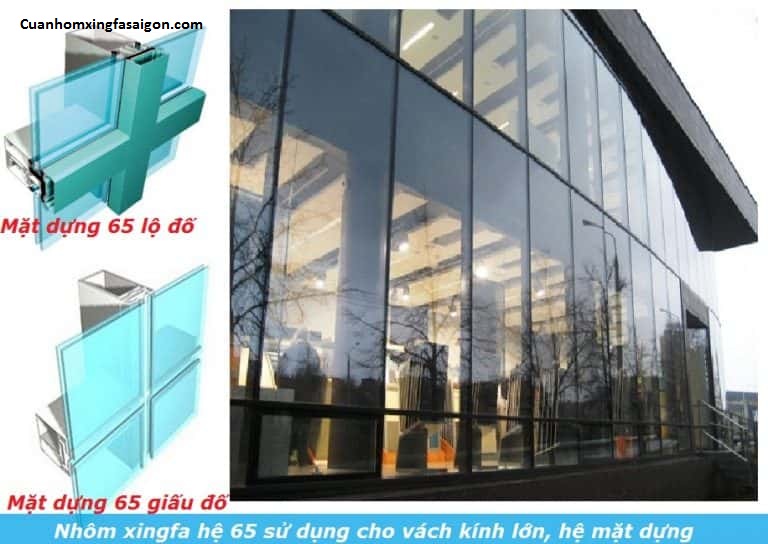 Nhôm hệ 65 có độ dày từ 2.5 – 3.5mm được sử dụng làm cho vách kính lớn ( vách mặt dựng ), được ứng dụng cho tòa nhà cần độ an toàn cao, khổ kính lớn… Nhôm xingfa hệ 65 được chia ra làm 2 loại: vách mặt dựng giấu đố và vách mặt dựng lộ đố.
