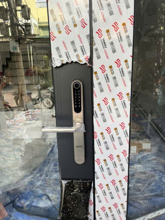 Chú thích ảnh: Khóa Siker KTS109 với thiết kế Slim tinh tế, lắp đặt thực tế trên hệ cửa nhôm cao cấp.