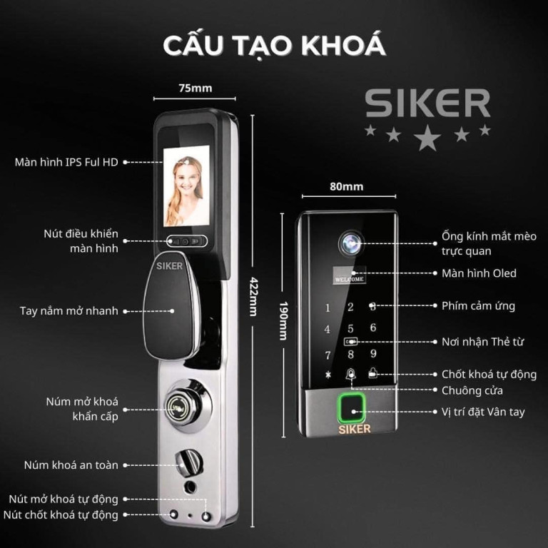 1. Khóa SIKER KTS501: Cấu tạo chuyên nghiệp và màn hình IPS Full HD SIKER KTS501 nổi bật với cấu tạo hiện đại và màn hình IPS Full HD sắc nét, cho phép bạn quan sát hình ảnh rõ ràng từ bên ngoài. Bên cạnh đó, các chi tiết như nút điều khiển màn hình, tay nắm mở nhanh, núm mở khóa khẩn cấp, núm khóa an toàn, nút mở khóa tự động và nút chốt khóa tự động được bố trí khoa học, tối ưu hóa trải nghiệm sử dụng hàng ngày. Phần ngoài tích hợp ống kính mắt mèo trực quan, màn hình OLED, phím cảm ứng, nơi nhận thẻ từ, chuông cửa và vị trí đặt vân tay, tất cả tạo nên một thiết kế hoàn hảo.
