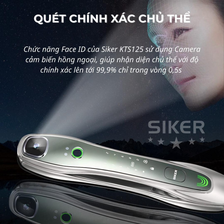 Siker KTS125 được trang bị công nghệ Face ID tiên tiến sử dụng camera cảm biến hồng ngoại, giúp nhận diện khuôn mặt chủ thể với độ chính xác lên đến 99.9% chỉ trong vòng 0.5s. Giờ đây, bạn có thể mở cửa chỉ bằng một ánh nhìn, không cần phải loay hoay tìm chìa khóa hay nhớ mật khẩu.