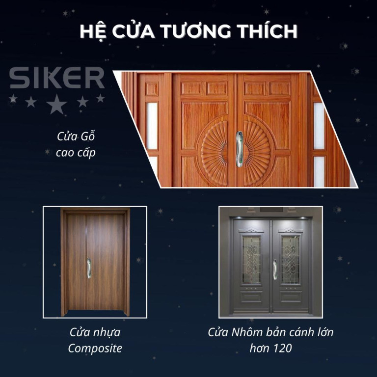 Siker KTS125 có thể lắp đặt trên nhiều loại cửa khác nhau như cửa gỗ cao cấp, cửa nhựa Composite và cửa nhôm bản cánh lớn.