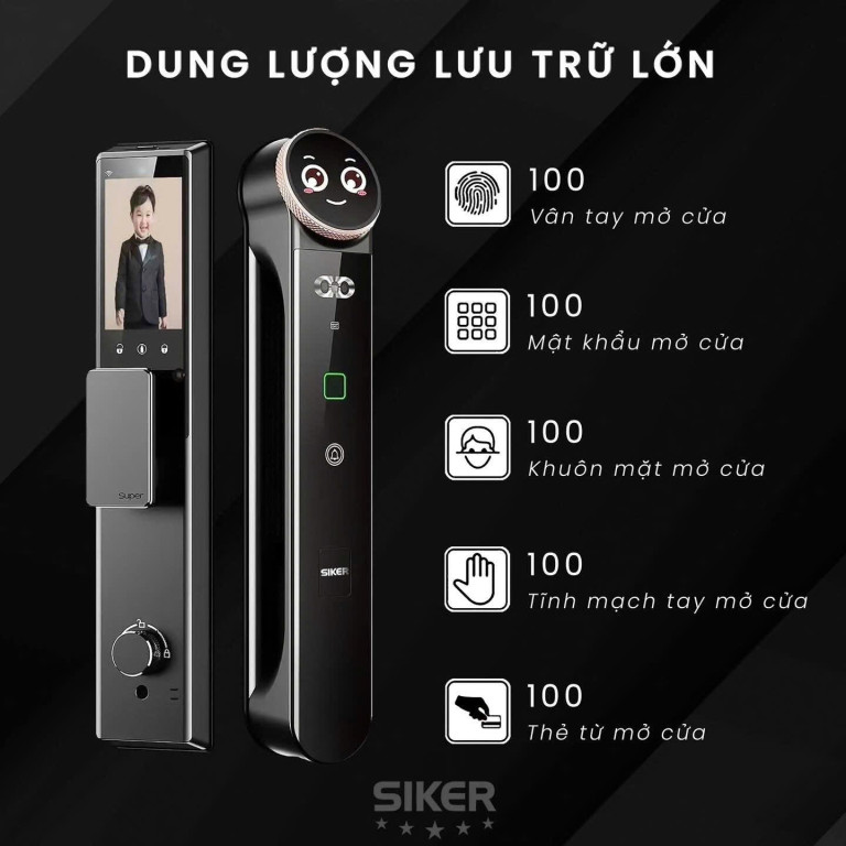 3. Dung lượng lưu trữ lớn, quản lý dễ dàng SIKER KTS900 AI có khả năng lưu trữ đến 100 dấu vân tay, 100 mật khẩu, 100 khuôn mặt, 100 tĩnh mạch tay và 100 thẻ từ. Điều này đặc biệt hữu ích cho những gia đình đông người hoặc các văn phòng, công ty. Việc quản lý thông tin người dùng trở nên đơn giản hơn bao giờ hết.